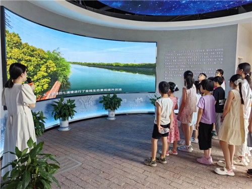 实践站更以文化赋能,辐射全域。今年5月,七浦塘水情教育馆试运营开放。这座350平方米的展馆以“回溯千年水脉,守护最美家乡河”为魂,通过“因水而生”“治水不懈”“千秋伟业”“守护家园”四大篇章,带领居民穿越历史长河,感悟人水共生的智慧,为生态文明教育添上厚重一笔。